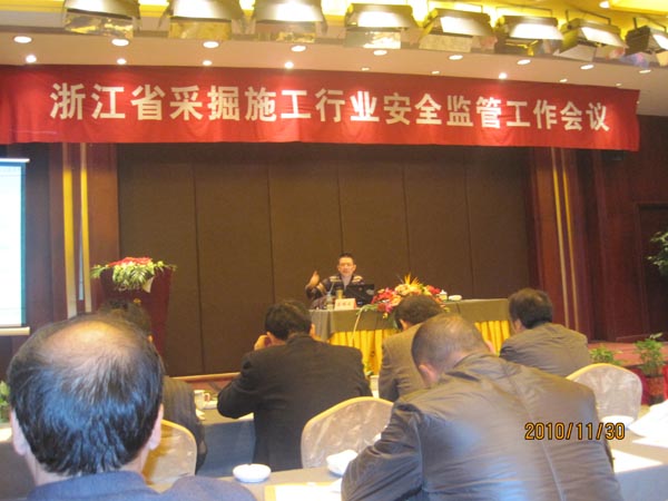 為深入貫徹《國務院安委會辦公室關于貫徹落實〈國務院關于進一步加強企業安全生產工作的通知〉精神進一步加強非煤礦山安全生產工作的實施意見》(安委會[2010]17號)和《中共浙江省委浙江省人民政府關于進一步加強安全生產工作的意見》(浙委[2009]88號)文件精神,落實好《浙江省安監局關于做好采掘施工企業安全標準化工作的通知》(浙安監管礦[2010]198號)要求,浙江省安監局于2010年11月29日至30日在臺州組織召開了全省采掘施工企業安全監管工作會議,參加會議人員有各市安監局礦山處負責人,各縣安監局分管局長和礦山科負責人,有關礦山中介機構負責人,采掘施工試點企業負責人和安全機構負責人,礦山工程施工總承包資質或土石方工程專業承包資質二級以上采掘施工企業負責人和安全機構負責人等140余名,我公司董事長朱為然和分管安全副經理張書巧參加了會議。